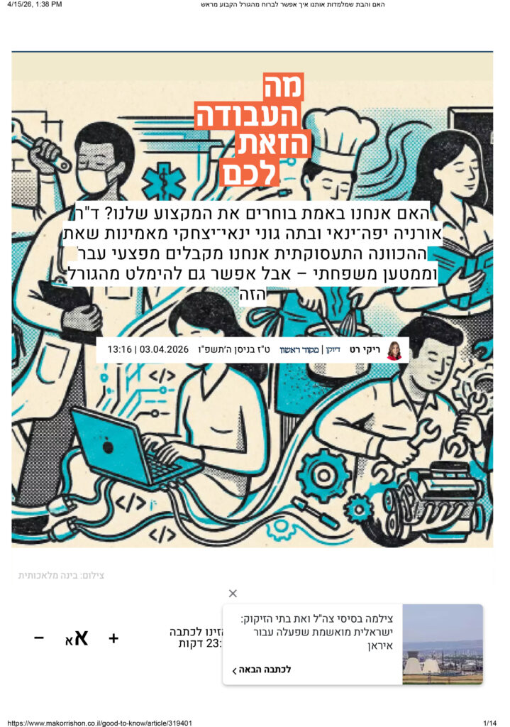 לרגל צאת הספר "ללכת בשבילי משמעות מפצע לריפוי -מסע בין דורי להגשמה דר' אורניה יפה ינאי , פסיכולוגית קלינית ותעסוקתית וגוני ינאי יצחקי, עו"סית קלינית בכתבה של בעיתון מקור ראשון מאת ריטי רט, קישור לכתבה: https://www.makorrishon.co.il/good-to-know/article/319401 למה העבודה היא גורם בעל משמעות רבה כל כך בחיים שלנו? אנשים מבלים הרבה זמן מחייהם בעבודה, וזה משפיע על כל מישורי החיים השונים, כשמשהו שם לא טוב לי, מכעיס, מכאיב או מתסכל , יש לכך השפעה